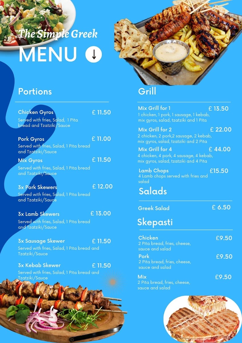 The grill section of the menu includes tempting options such as the Mix Grill For 1, Mix Grill For 2, Mix Grill For 4, and the larger Mix Grill For 6. If you’re in the mood for a burger, the Chicken Burger is a great pick. The Skepasti choices include Chicken, Pork, and Mix, as well as the flavorful Bifteki. Finally, the Skewers Souvlaki menu presents a variety of grilled meats like Chicken Skewer, Pork Skewer, Kebab Skewer, Sausage Skewer, and Lamb Skewer, ensuring there’s something for everyone to enjoy. The menu is a feast of Greek-inspired flavors that will leave you coming back for more.
