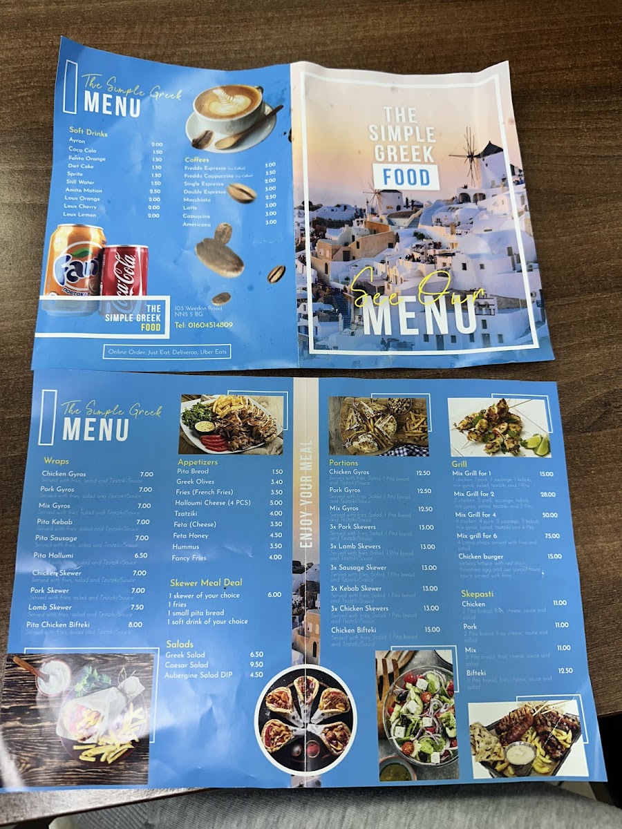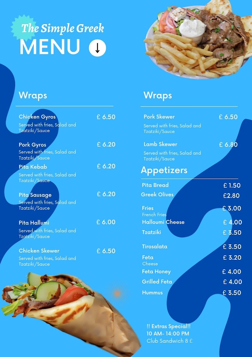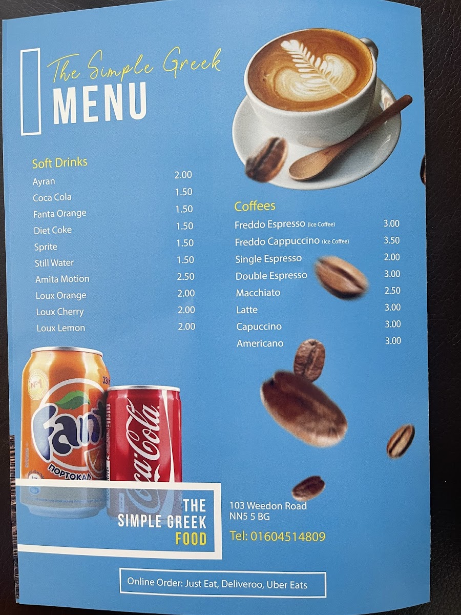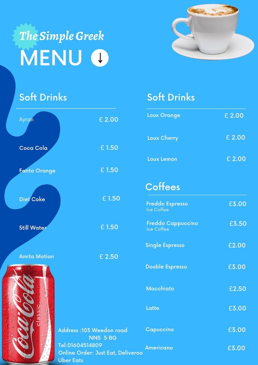The menu at The Simple Greek in Northampton offers a wide variety of authentic Greek dishes, perfect for anyone craving flavorful Mediterranean cuisine. For a refreshing start, you can choose from soft drinks like Ayran or sodas such as Coca Cola, Fanta Orange, Diet Coke, and Sprite. The wrap options include tasty choices like Chicken Gyros, Pork Gyros, and the Mix Gyros. If you prefer pita, the Pita Kebab and Pita Sausage are delightful options. For a caffeine kick, the coffee menu offers several espresso-based drinks, including Freddo Espresso, Freddo Cappuccino, and the more intense Single Espresso or Double Espresso.
