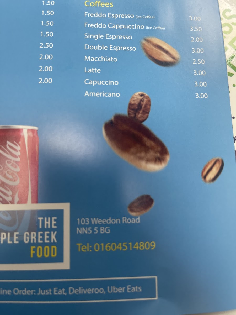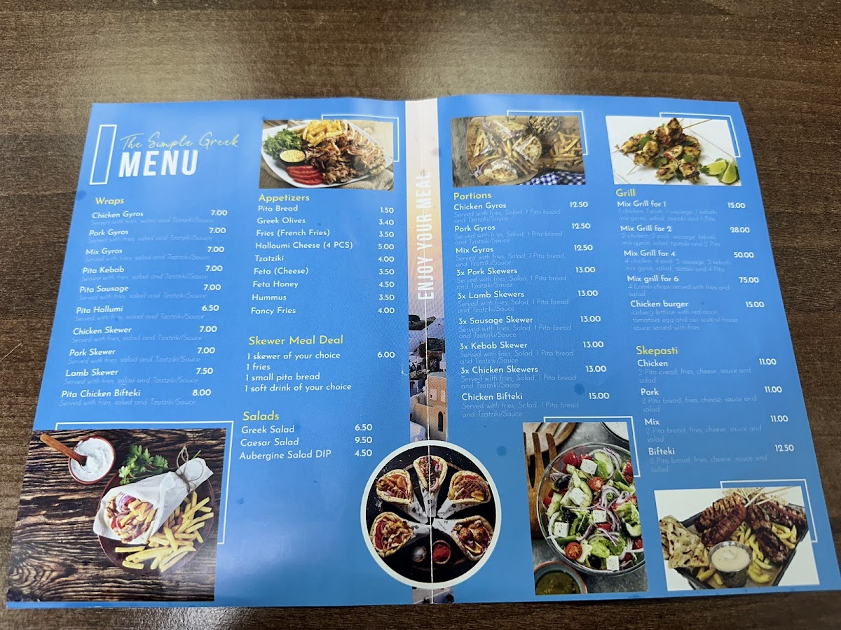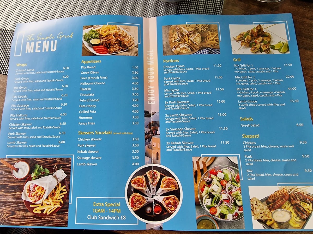 The menu at The Simple Greek in Northampton offers a wide variety of authentic Greek dishes, perfect for anyone craving flavorful Mediterranean cuisine. For a refreshing start, you can choose from soft drinks like Ayran or sodas such as Coca Cola, Fanta Orange, Diet Coke, and Sprite. The wrap options include tasty choices like Chicken Gyros, Pork Gyros, and the Mix Gyros. If you prefer pita, the Pita Kebab and Pita Sausage are delightful options. For a caffeine kick, the coffee menu offers several espresso-based drinks, including Freddo Espresso, Freddo Cappuccino, and the more intense Single Espresso or Double Espresso.